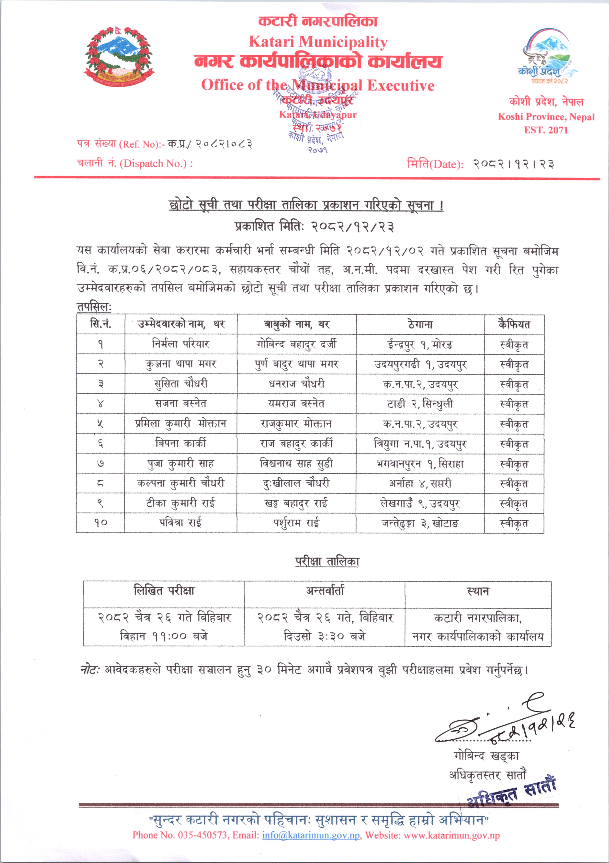 छोटो सूची तथा परीक्षा तालिका प्रकाशन सम्बन्धी सूचना ।