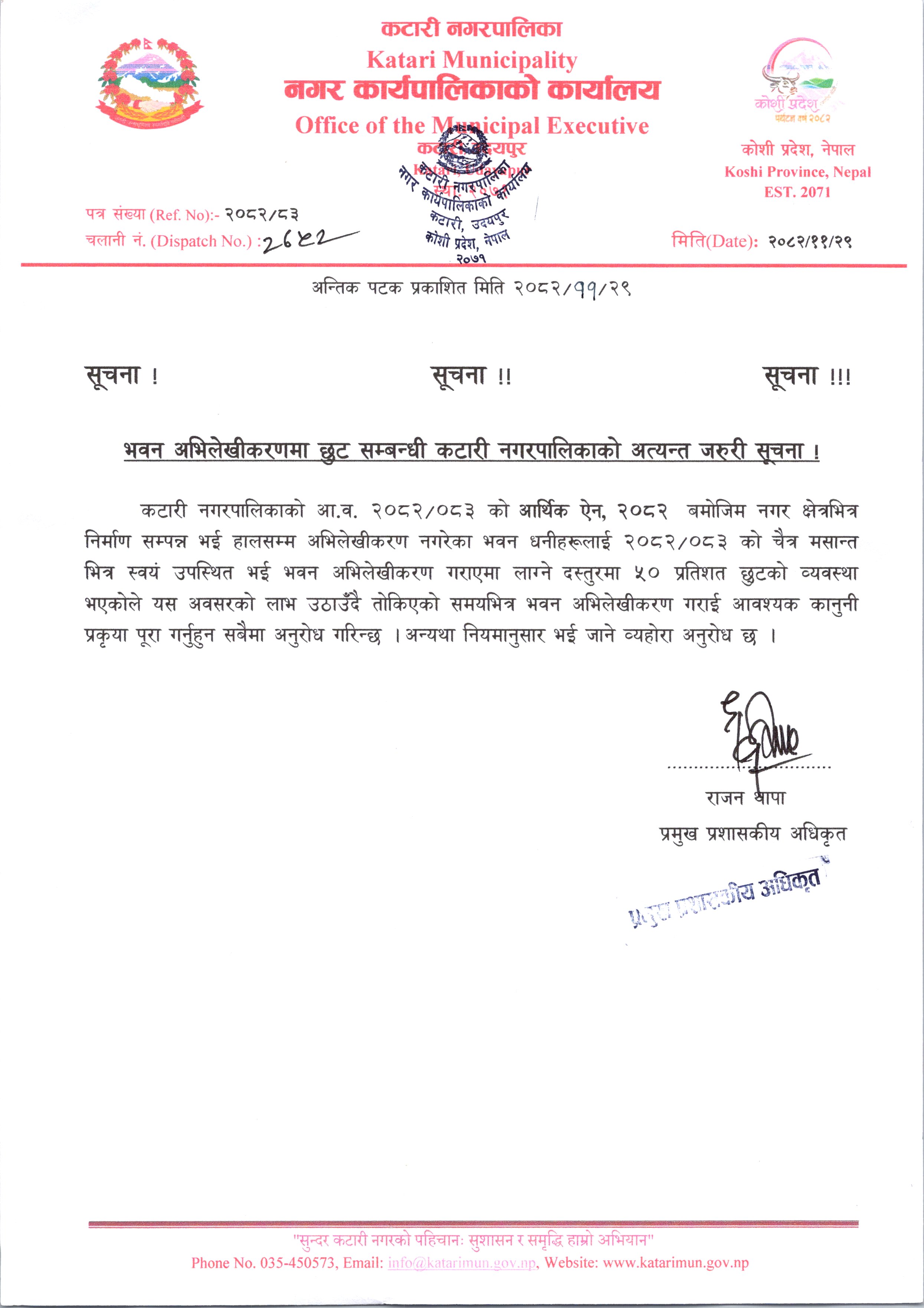 भवन अभिलेखीकरण छुट सम्बन्धी अन्तिम पटक प्रकाशित सूचना।