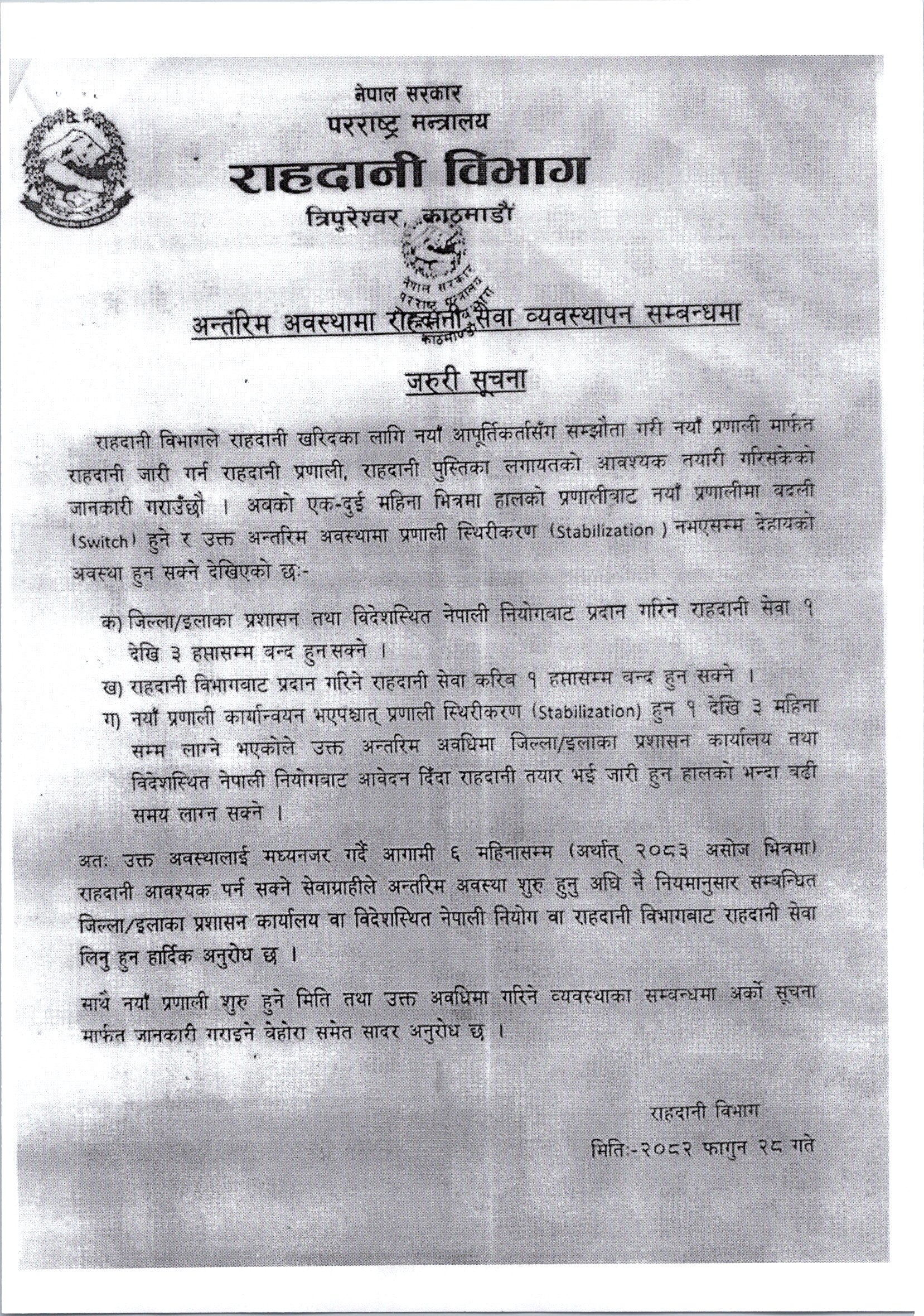 राहदानी विभागको अन्तरिम अवस्थामाः राहदानी सेवा व्यवस्थापन सम्बन्धी सूचना ।