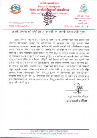 सहकारी संस्थाको दर्ता अभिलेखीकरण समयसीमा थप सम्बन्धी अत्यन्त जरुरी सूचना ।