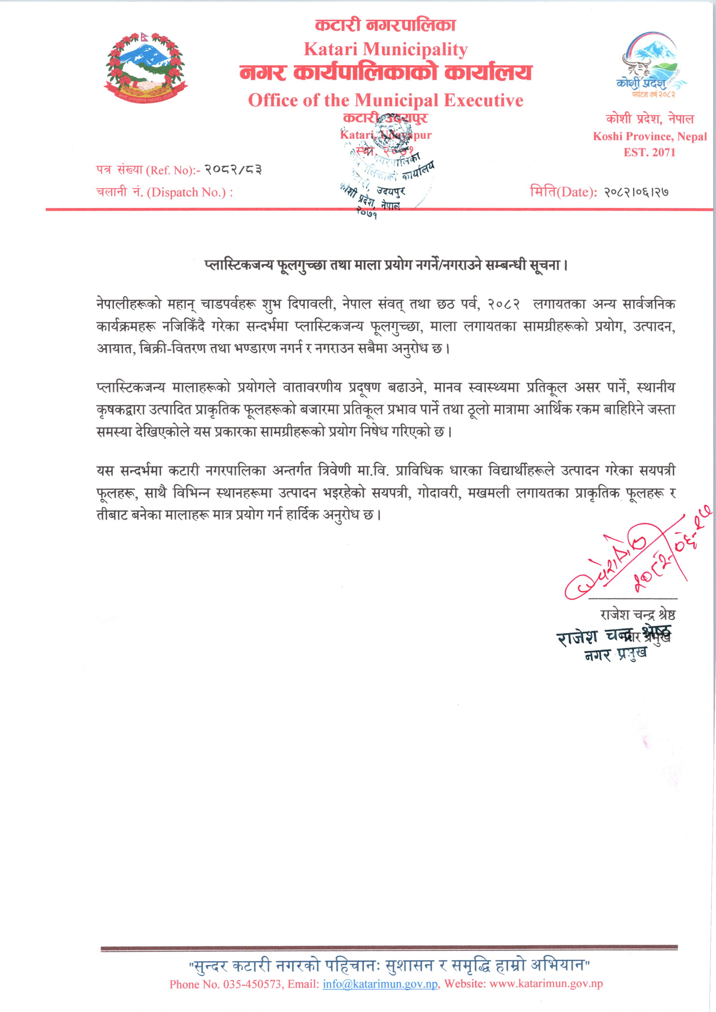 » प्लास्टिकजन्य फूलगुच्छा तथा माला प्रयोग नगर्ने/नगराउने सम्बन्धी सूचना।