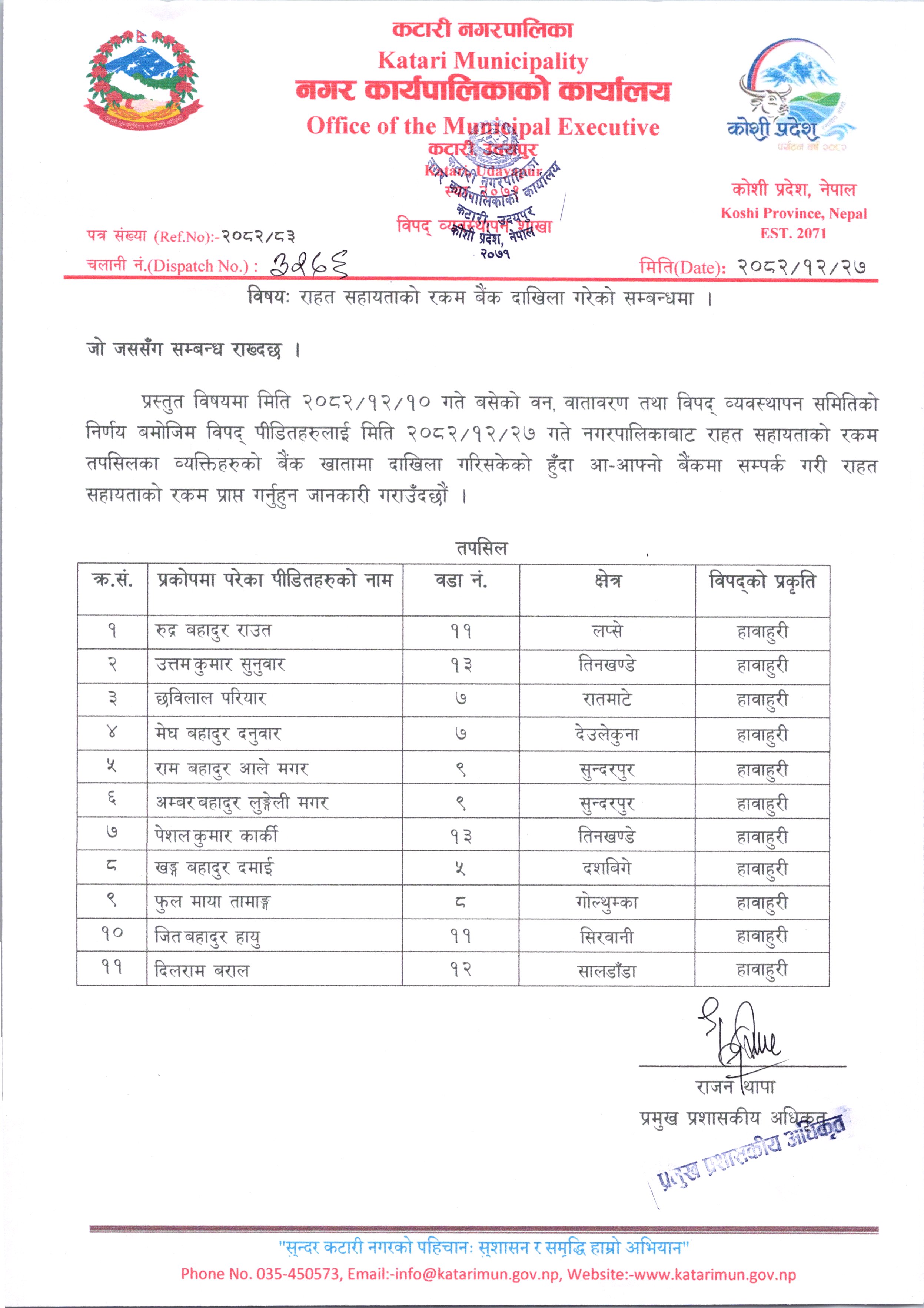 राहत सहायता रकम बैंक दाखिला सम्बन्धमा।