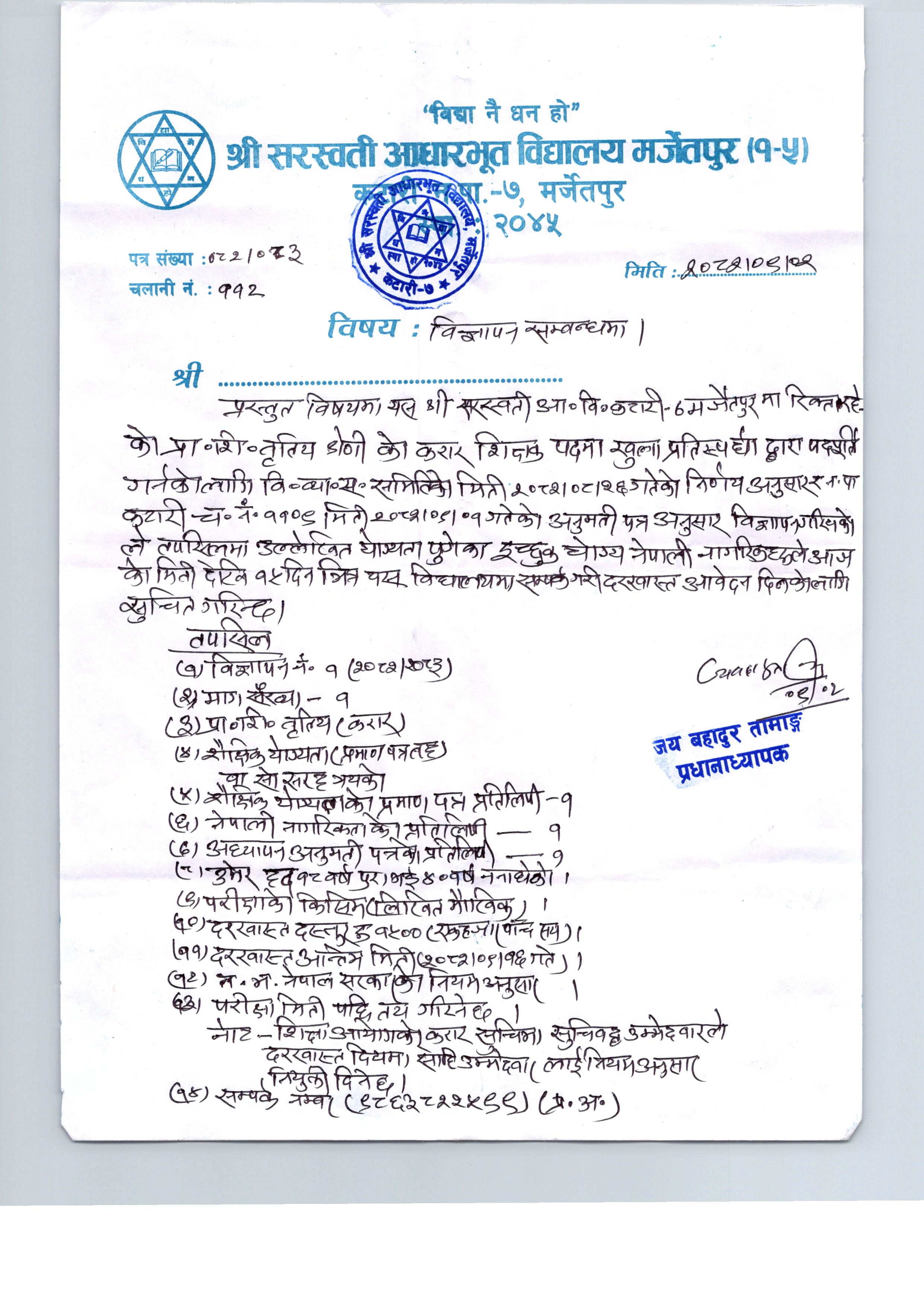 » श्री सरस्वती आधारभूत विद्यालय, मर्जेतपुरका लागि शिक्षक आवश्यकता सम्बन्धी सूचना।
