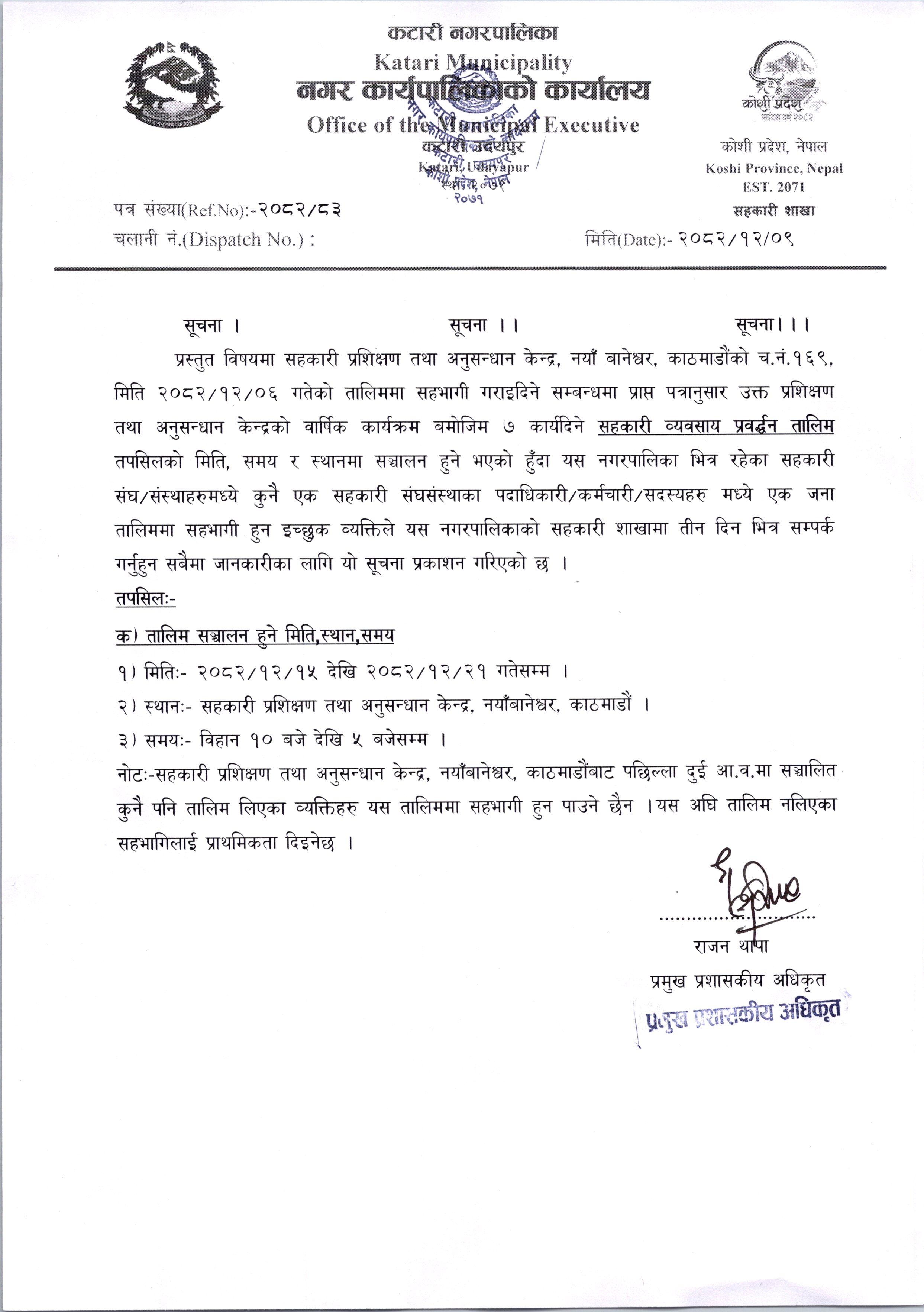 सहकारी व्यवसाय प्रवर्द्धन तालिम सम्बन्धी सूचना ।