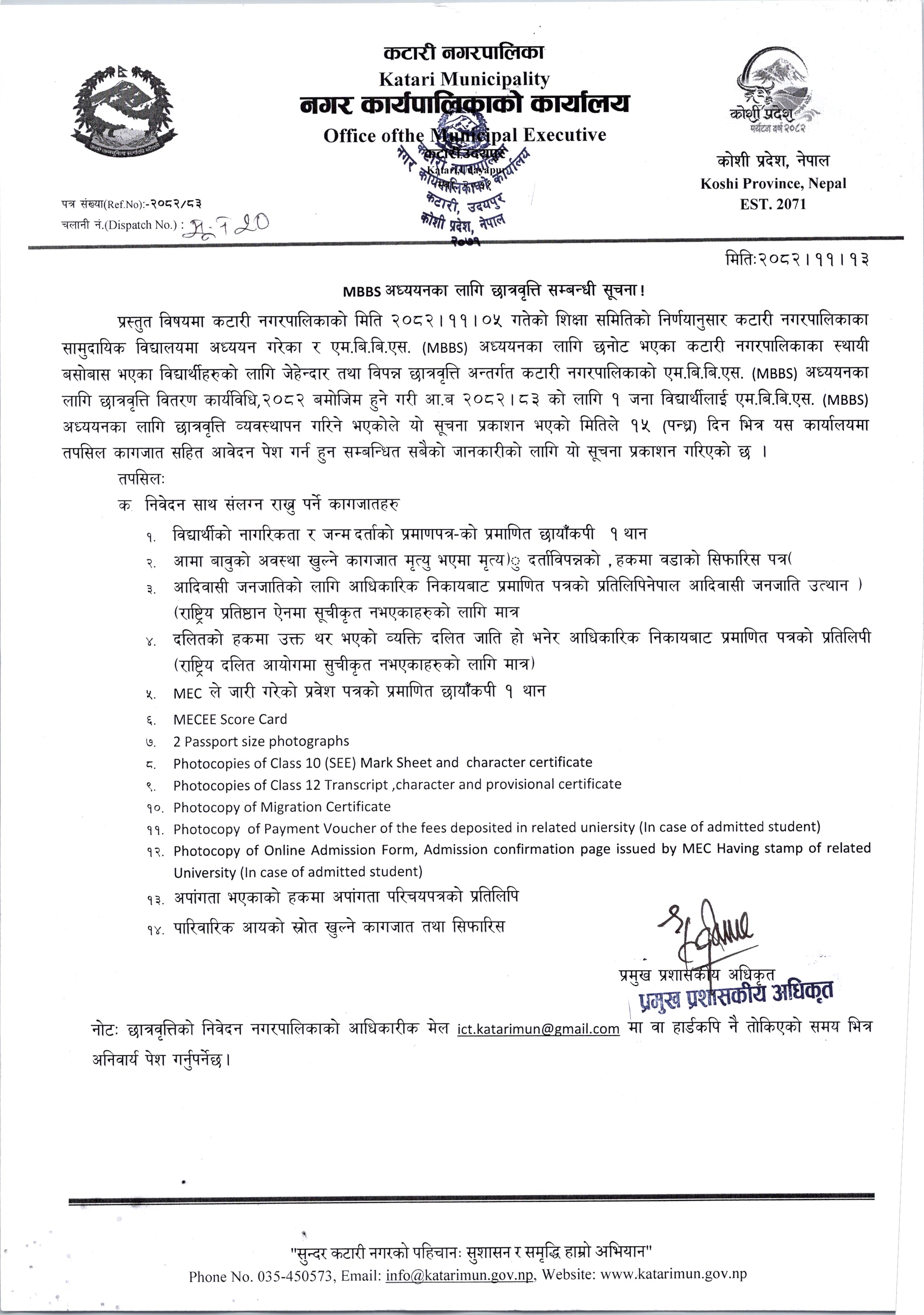 MBBS अध्ययनका लागि छात्रवृत्ति सम्बन्धी सूचना l